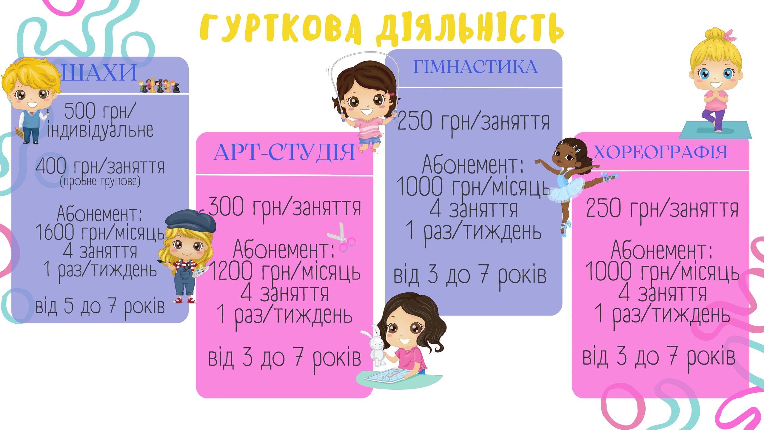 Дитячий садок нашого простору надає чимало послуг. Для детального ознайомлення з послугами та тарифами нашого дитячого міні-садочку - перейдіть за посиланням нижче.